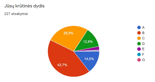 Analizuojant gautus rezultatus matome, kad didžioji dalis 42,7 proc. projekte dalyvavusių moterų turi B dydžio krūtis (97 moterys iš 227 atsakiusių į šį klausimą). Taip pat nemažą dalį 26,9 proc. projekto dalyvių sudarė moterys, kurių krūtų dydis yra C (61 atsakymas). 14,5 proc. moterų turėjo mažą A dydžio krūtinę (33), 12,8 proc. didelę D dydžio krūtinę (29). Dar didesnes krūtis turėjo tik keletas moterų: E dydį turinčios nurodė 2,2 proc. moterų (5), F – 0,4 proc. (1) ir G taip pat 0,4 proc. (1).