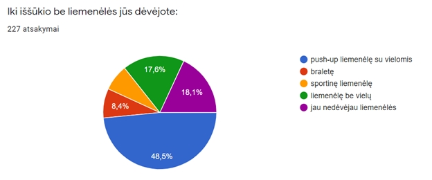 Dauguma projekto dalyvių, 48,5 proc. (110 iš 227), nurodė, jog iki projekto pradžios dėvėjo pakeliančią ("push-up") liemenėlę su vielutėmis. 17,6 proc. moterų (40) dėvėjo liemenėles be vielų, 8,4 proc. rinkosi braletę (19), 7,5 proc. – sportinę liemenėlę (17). 18,1 proc. dalyvavusių apklausoje moterų jau iki iššūkio pradžios nebedėvėjo liemenėlės ir prisijungė prie projekto iš solidarumo (41).
